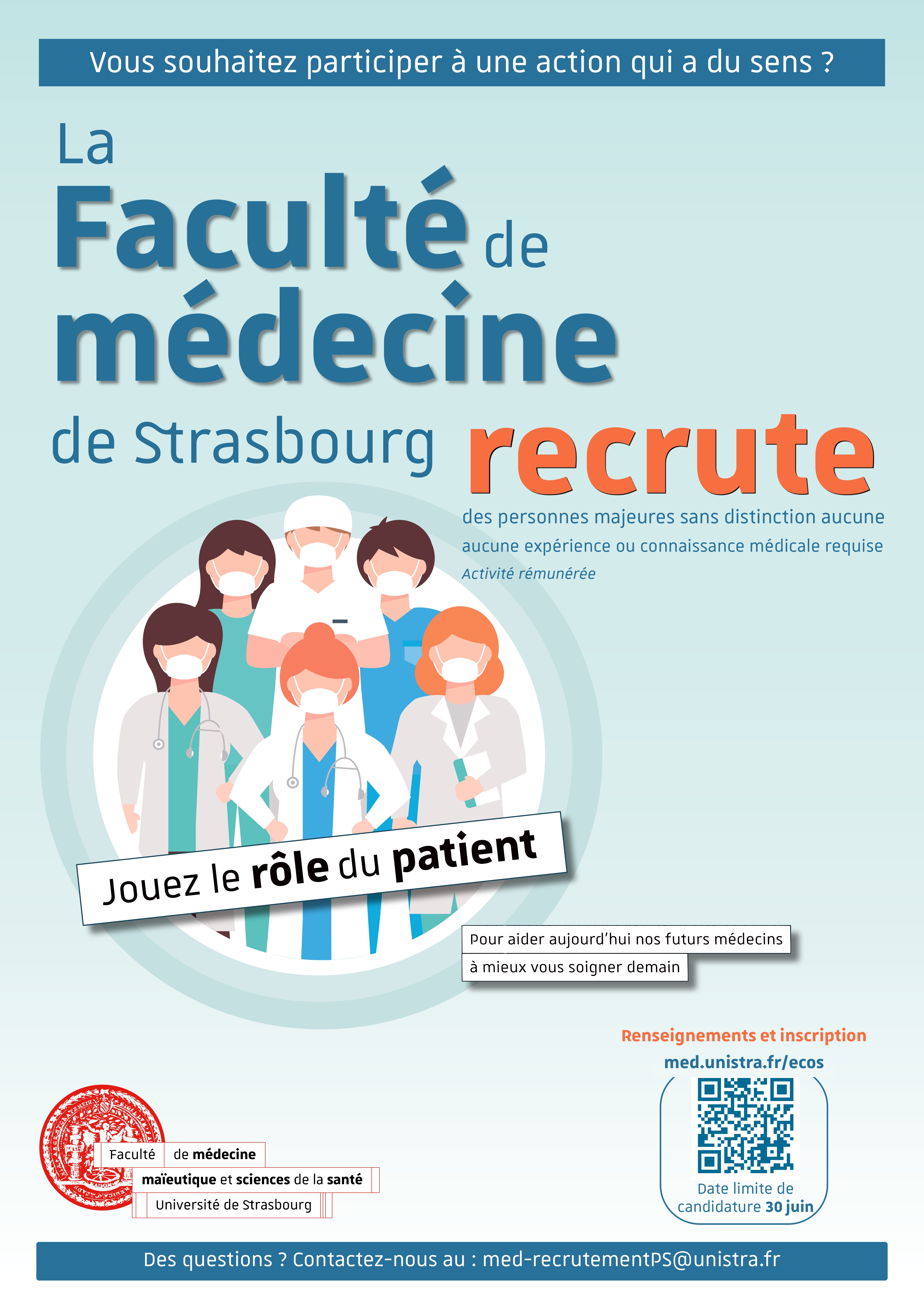 La Faculté de médecine, maïeutique et sciences de la santé de l’Université de Strasbourg lance le recrutement de près de 70 « patients simulés » pour participer activement à la formation des futurs professionnels de santé, contre rémunération.